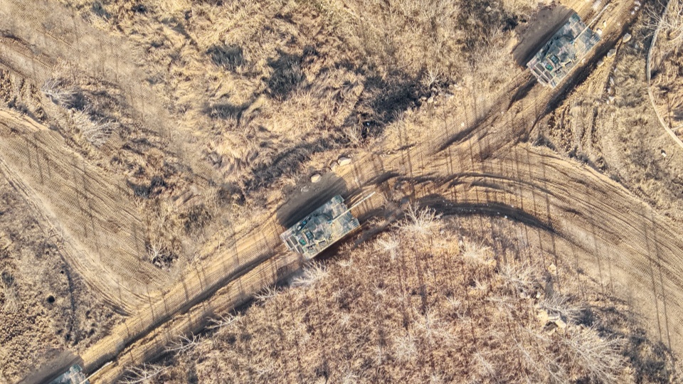 Main battle tanks march in formation
