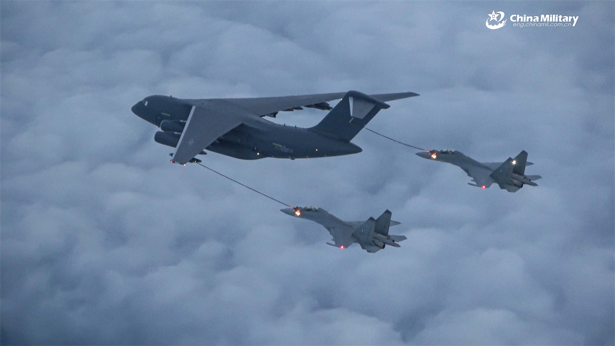 YY-20 tanker aircraft attached to the air force under the Chinese PLA Eastern Theater Command refuels two J-16 fighter jets during a flight training exercise. (eng.chinamil.com.cn/Photo by Xiong Wei)