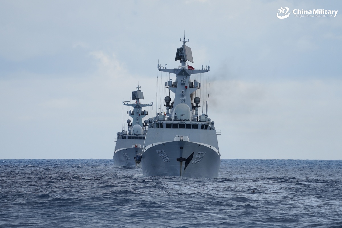 Guided-missile frigates Bayannaoer (Hull 551) and Tongliao (Hull 554) attached to a naval flotilla under the Chinese PLA Southern Theater Command cut through the waves during a maritime combat training exercise in late September, 2025. (eng.chinamil.com.cn/Photo by Cai Shengqiu)9月下旬,南部战区海军某支队组织舰艇编队开展海上实战化训练。图为编队航行。(英文中国军网/蔡盛秋 摄)