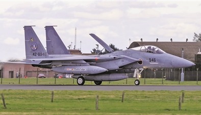 资料图:日本F-15J战斗机降落在英国科宁斯比空军基地。