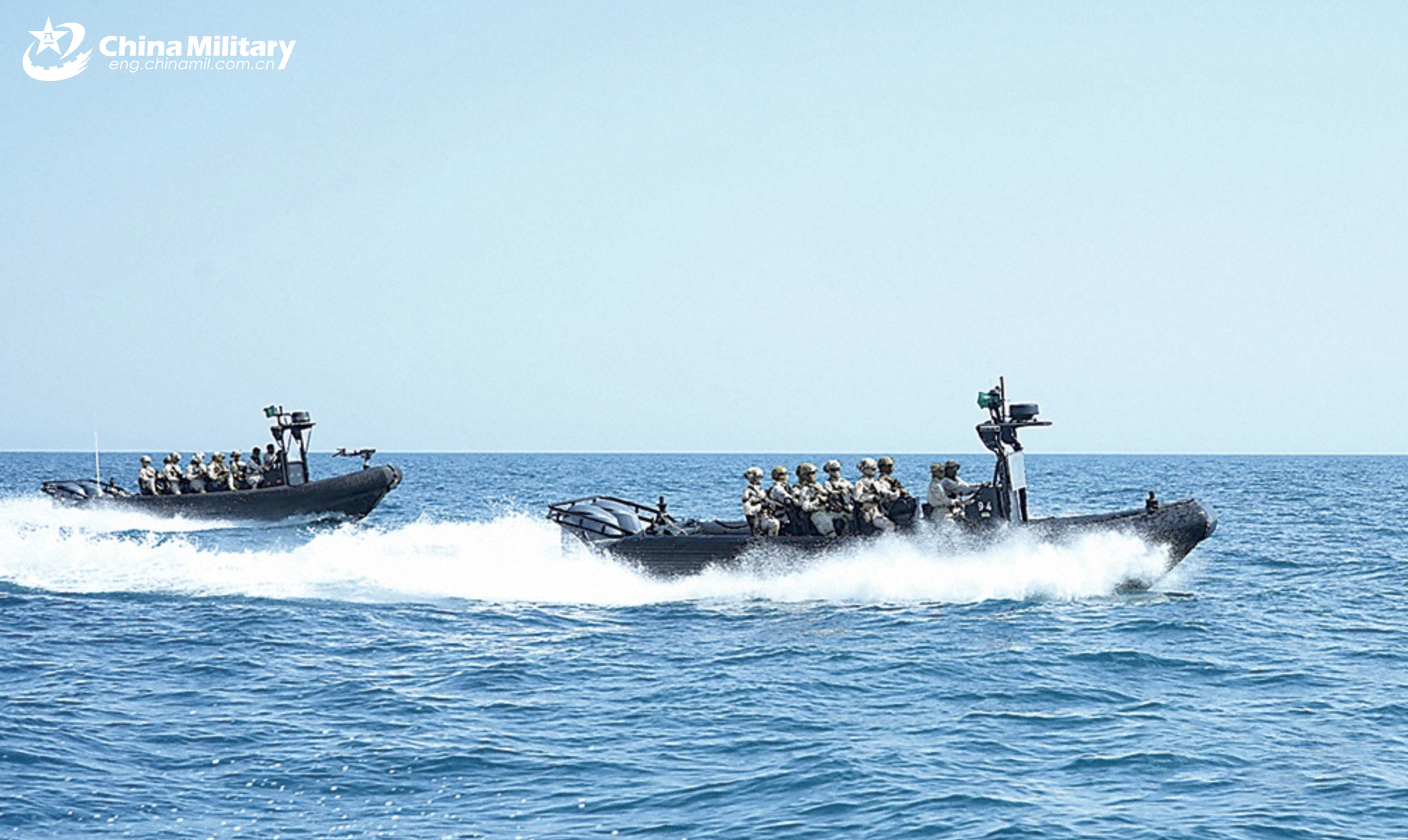 Participating troops of the two sides advance to the mission sea area by assault boats for maritime rescue training during the China-Saudi Arabia Blue Sword-2025 naval joint training. (Photo by He Weiguo)