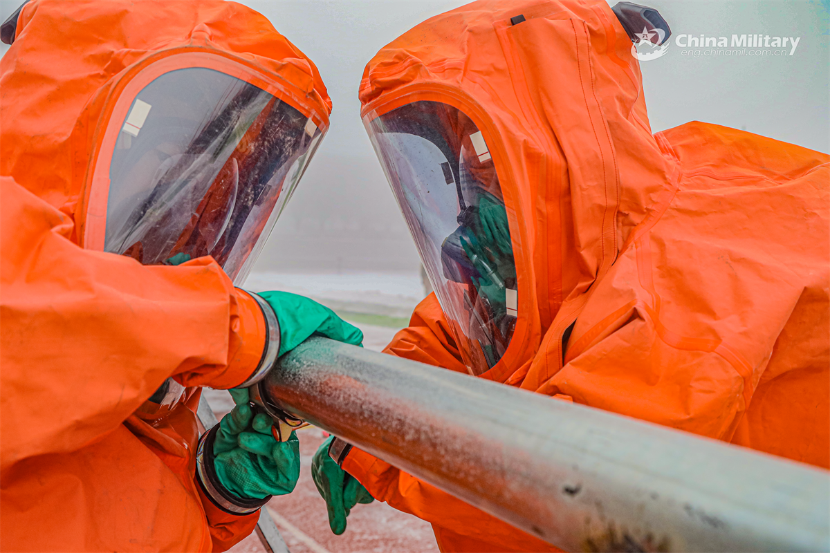 Soldier assigned to a regiment under the Chinese PLA Army cooperate to seal the leaked chemical pipeline using circular clamp during a Chemical, Biological, Radioactive and Nuclear (CBRN) decontamination drill. (eng.chinamil.com.cn/Photo by Zeng Cunjun , Li Linhuan and Li Xianliang)