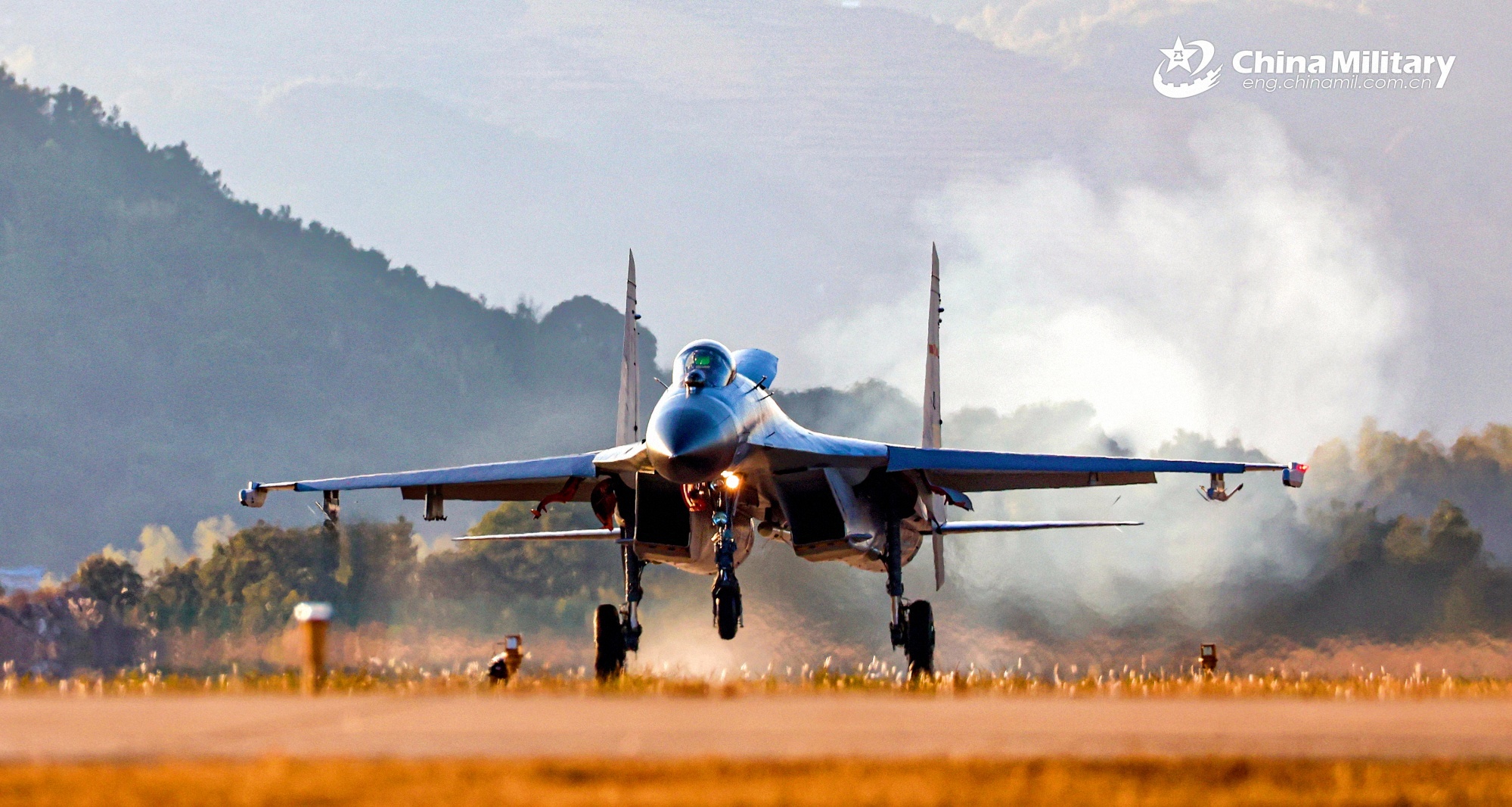 A J-11 fighter jet attached to a unit with the air force under the Chinese PLA Eastern Theater Command lands on the runway after a flight training exercise on January 6, 2026. (eng.chinamil.com.cn/Photo by Li Kai)1月6日,东部战区空军某部开展飞行训练。图为战机降落。(英文中国军网/李凯 摄)
