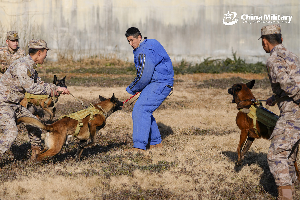 Military working dogs assigned to a Chinese PLA Army brigade conduct pounce and bite work training at the order of their trainers during a multi-subject training exercise. (eng.chinamil.com.cn/Photo by Pu Liangchen)