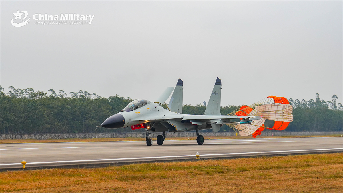 A J-11BSH fighter jet attached to an aviation unit with the navy under the Chinese PLA Southern Theater Command pops a drag parachute to slow down on the runway after a flight training exercise. (eng.chinamil.com.cn/Photo by Fu Jinquan)