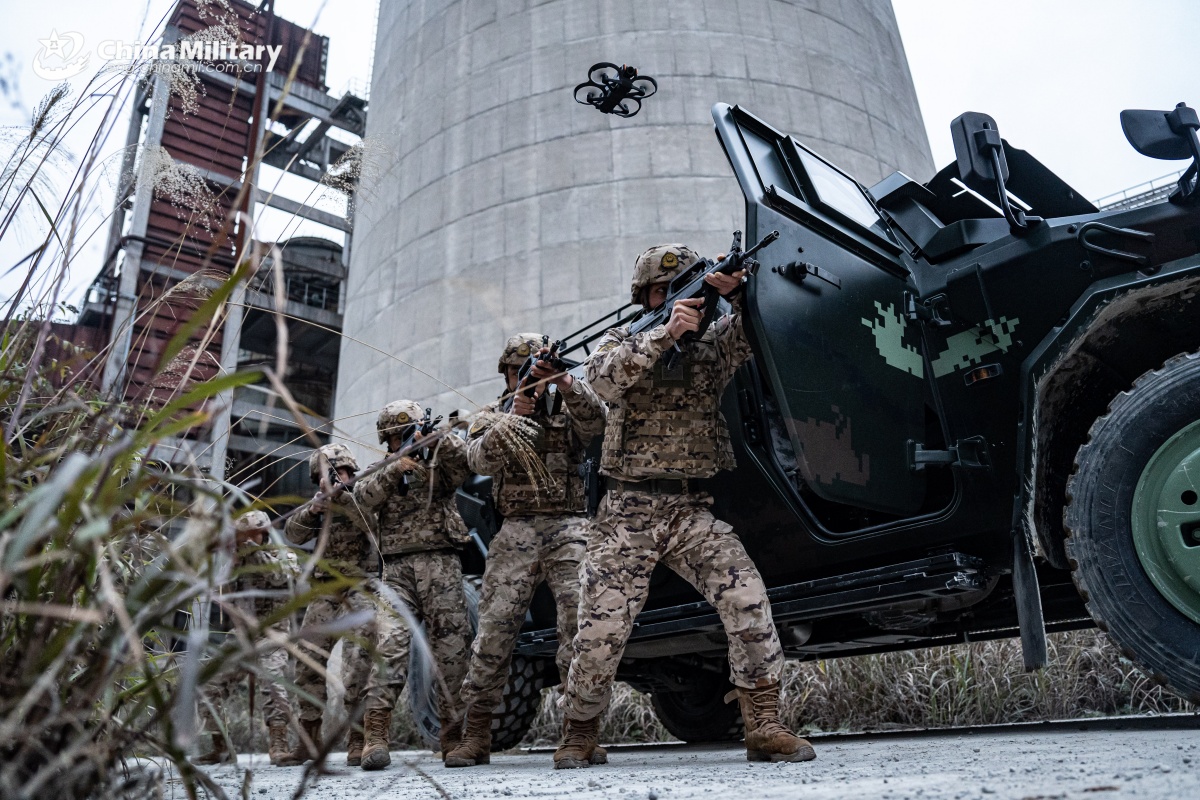 Soldiers assigned to the fifth detachment of the Chinese People's Armed Police (PAP) Force Chongqing Corps maintain vigilance in coordination with a drone during a search and annihilation combat training exercise on January 23, 2026. (eng.chinamil.com.cn/Photo by Wang Zhanming)
