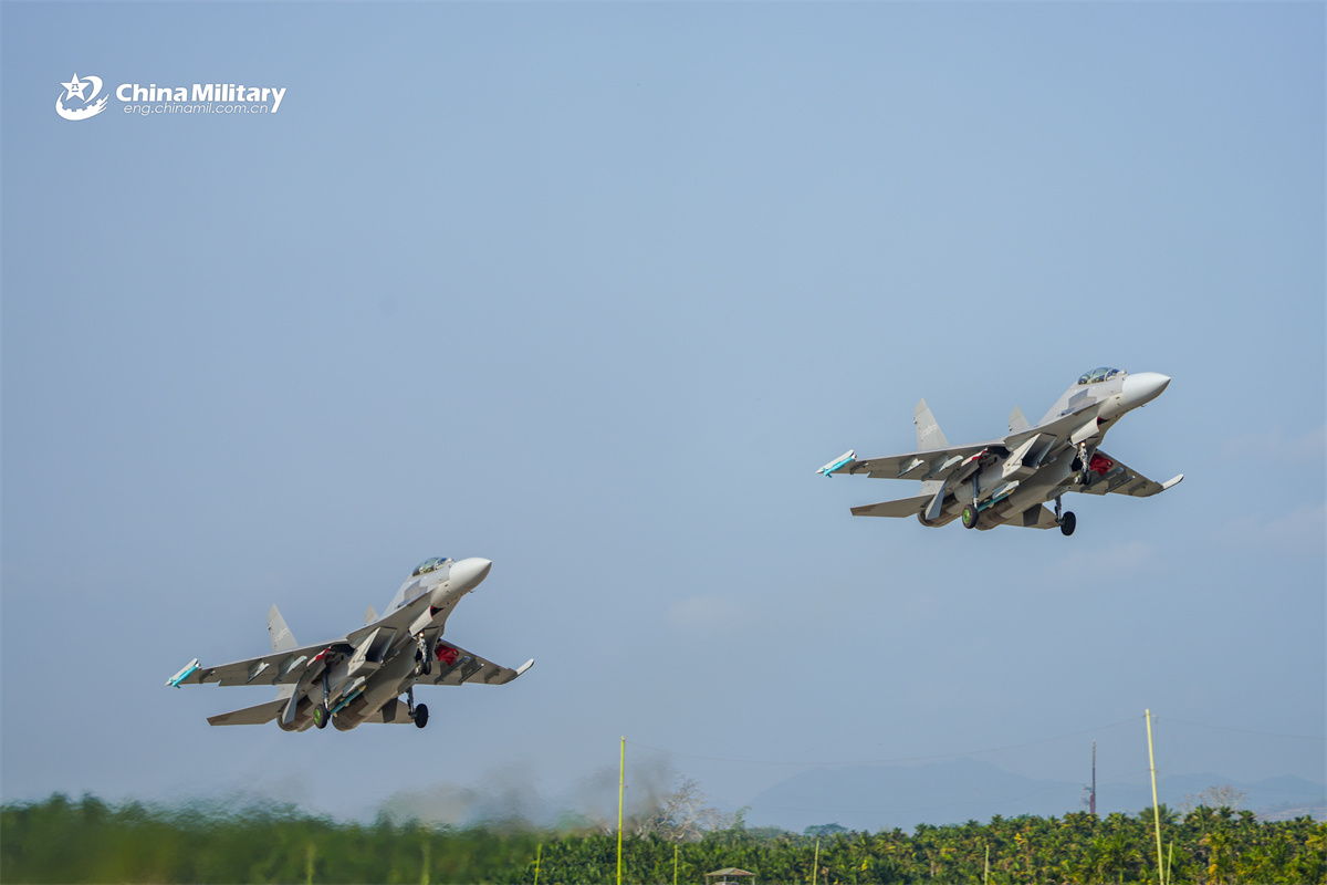 J-16 fighter jets attached to a unit with the air force under the Chinese PLA Northern Theater Command soar into the sky during a training exercise on March 25, 2026. (eng.chinamil.com.cn/Photo by Zhao Yutong)