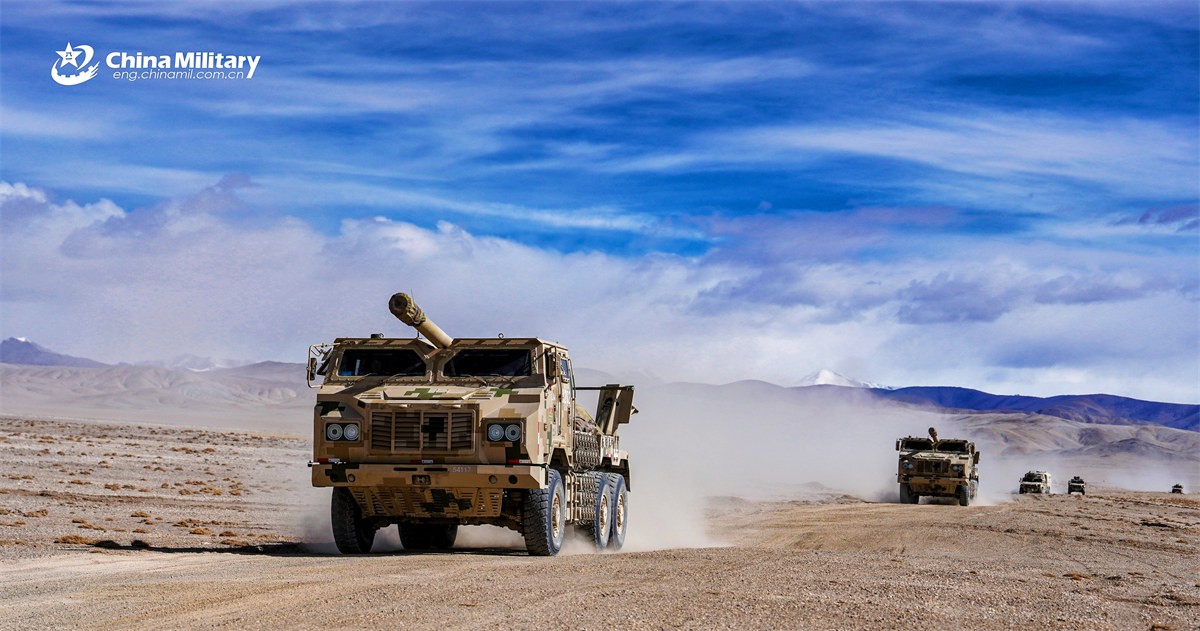 Vehicle-mounted howitzers attached to a regiment under the Chinese PLA Xinjiang Military Command rumble toward the designated position during a round-the-clock live fire shooting training exercise in the hinterland of Karakoram mountain range. (eng.chinamil.com.cn/Photo by Chen Jiliang)近日,新疆军区某团在在海拔5000余米的喀喇昆仑腹地开展了一场跨昼夜实弹射击演练,全面检验了各火力分队的快速反应、协同配合与精准打击能力。(英文中国军网/陈继亮 摄)