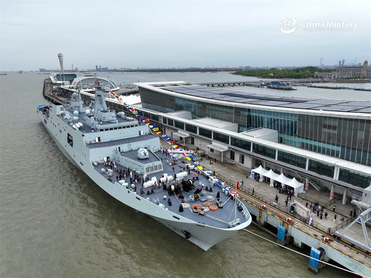 This aerial drone photo shows the amphibious dock landing ship Yimengshan (Hull 988) docking at the Wusongkou International Cruise Terminal during an open-ship event in east China's Shanghai on April 23, 2026. China celebrated the 77th anniversary of the founding of its navy on April 23, opening naval bases in more than 10 cities to the public. (eng.chinamil.com.cn/Photo by Jin Hanyu)
