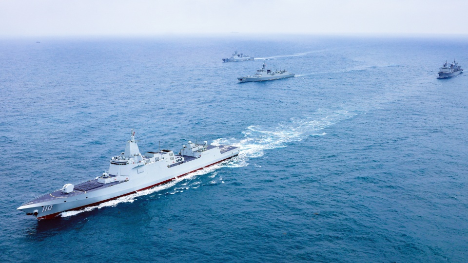 Type 055 Destroyers Anqing and Dongguan Conduct Combat Training
