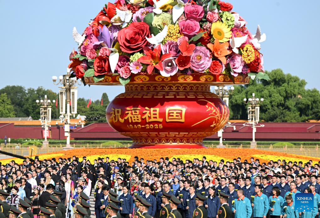 A ceremony to present flower baskets to fallen national heroes to mark Martyrs' Day is held at Tian'anmen Square in Beijing, capital of China, Sept. 30, 2025. (Xinhua/Yue Yuewei)