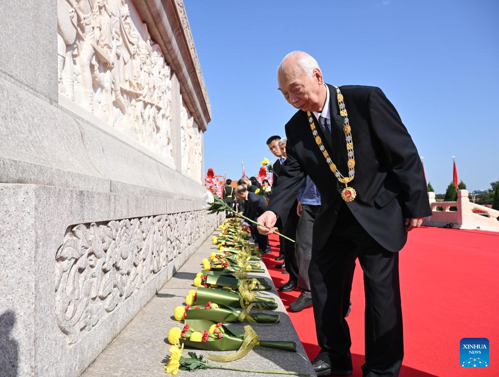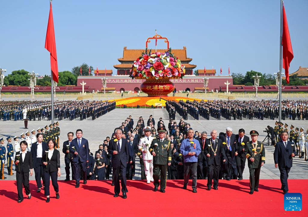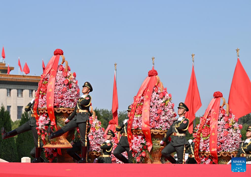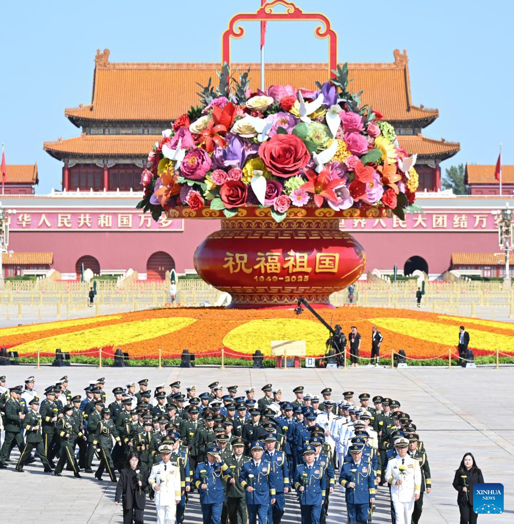 A ceremony to present flower baskets to fallen national heroes to mark Martyrs' Day is held at Tian'anmen Square in Beijing, capital of China, Sept. 30, 2025. (Xinhua/Zhang Ling)
