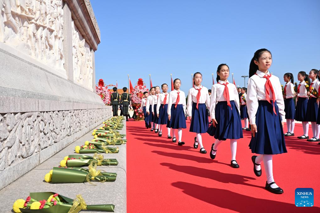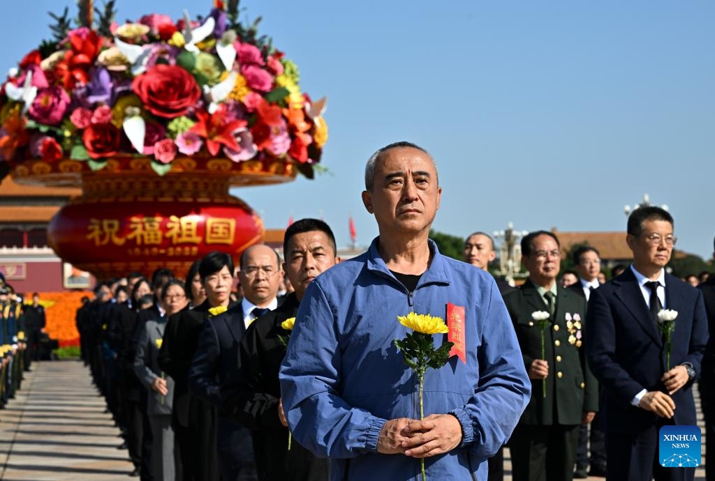 A ceremony to present flower baskets to fallen national heroes to mark Martyrs' Day is held at Tian'anmen Square in Beijing, capital of China, Sept. 30, 2025. (Xinhua/Li Xiang)
