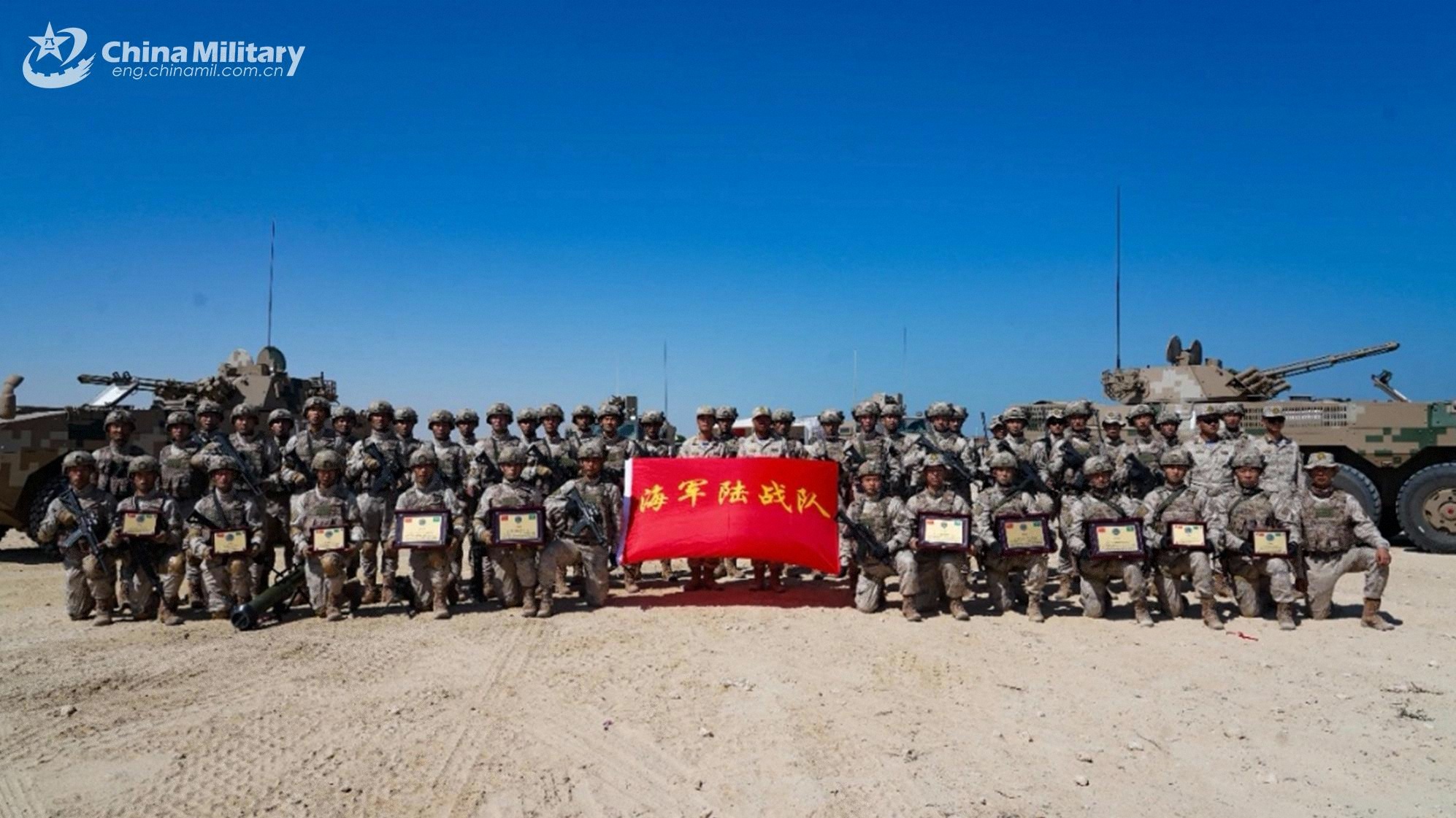 The Chinese participating troops pose for a group photo during the China-Saudi Arabia Blue Sword-2025 naval joint training.