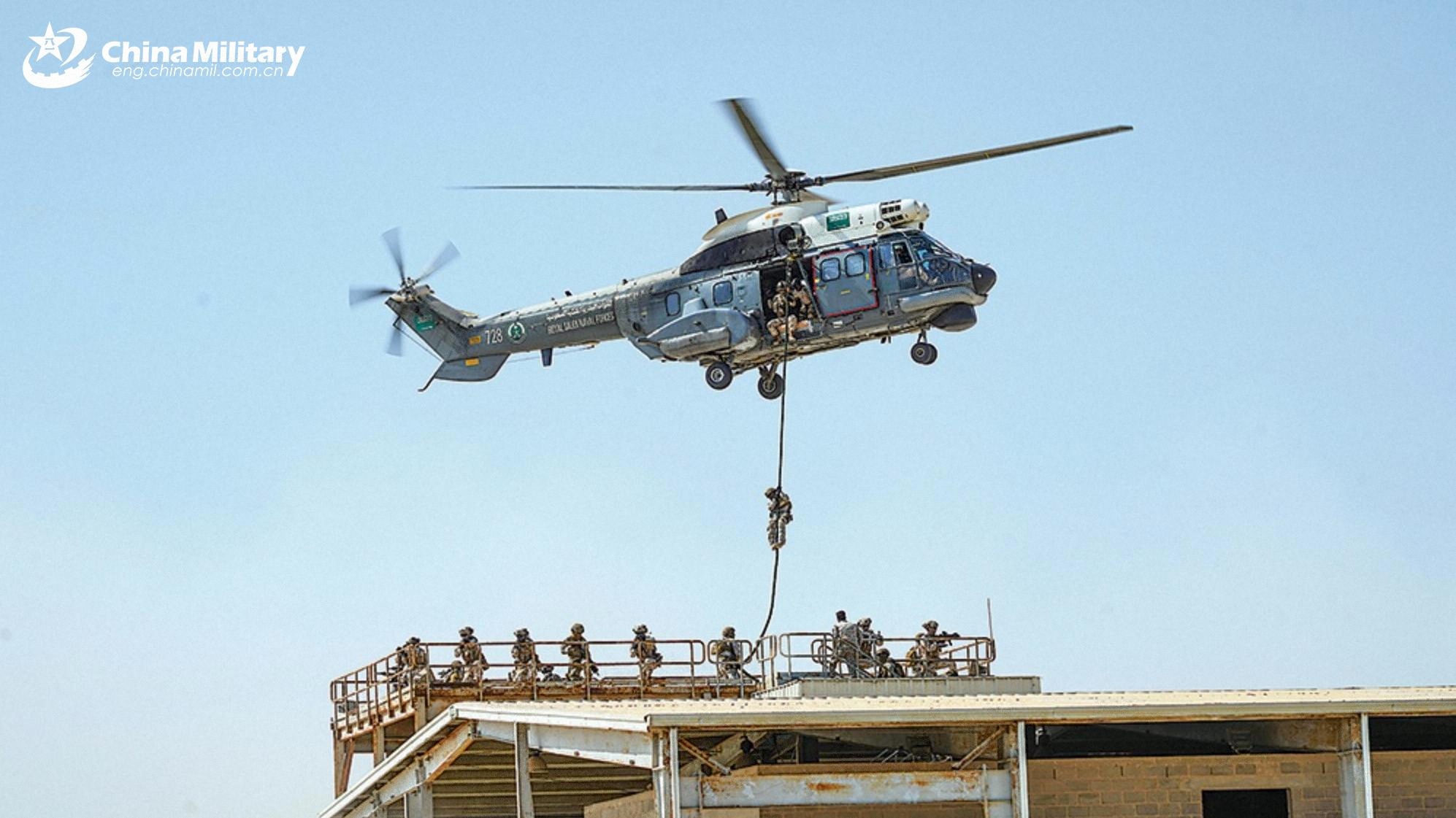 Participating troops conduct helicopter fast-roping training during the China-Saudi Arabia Blue Sword-2025 naval joint training. (Photo by He Weiguo)