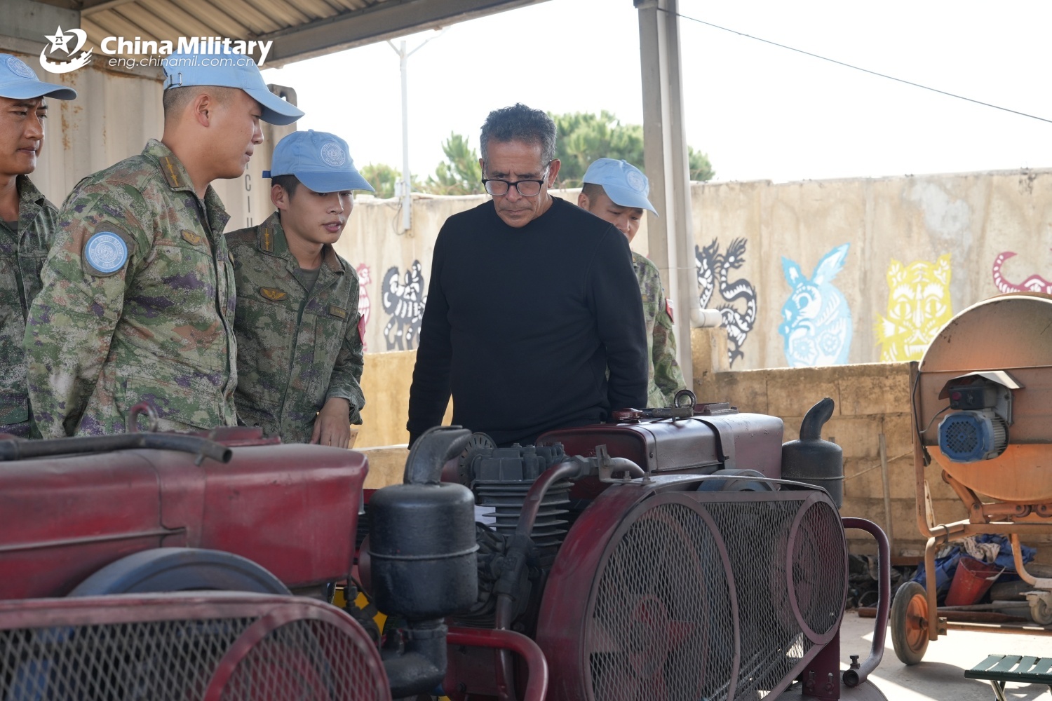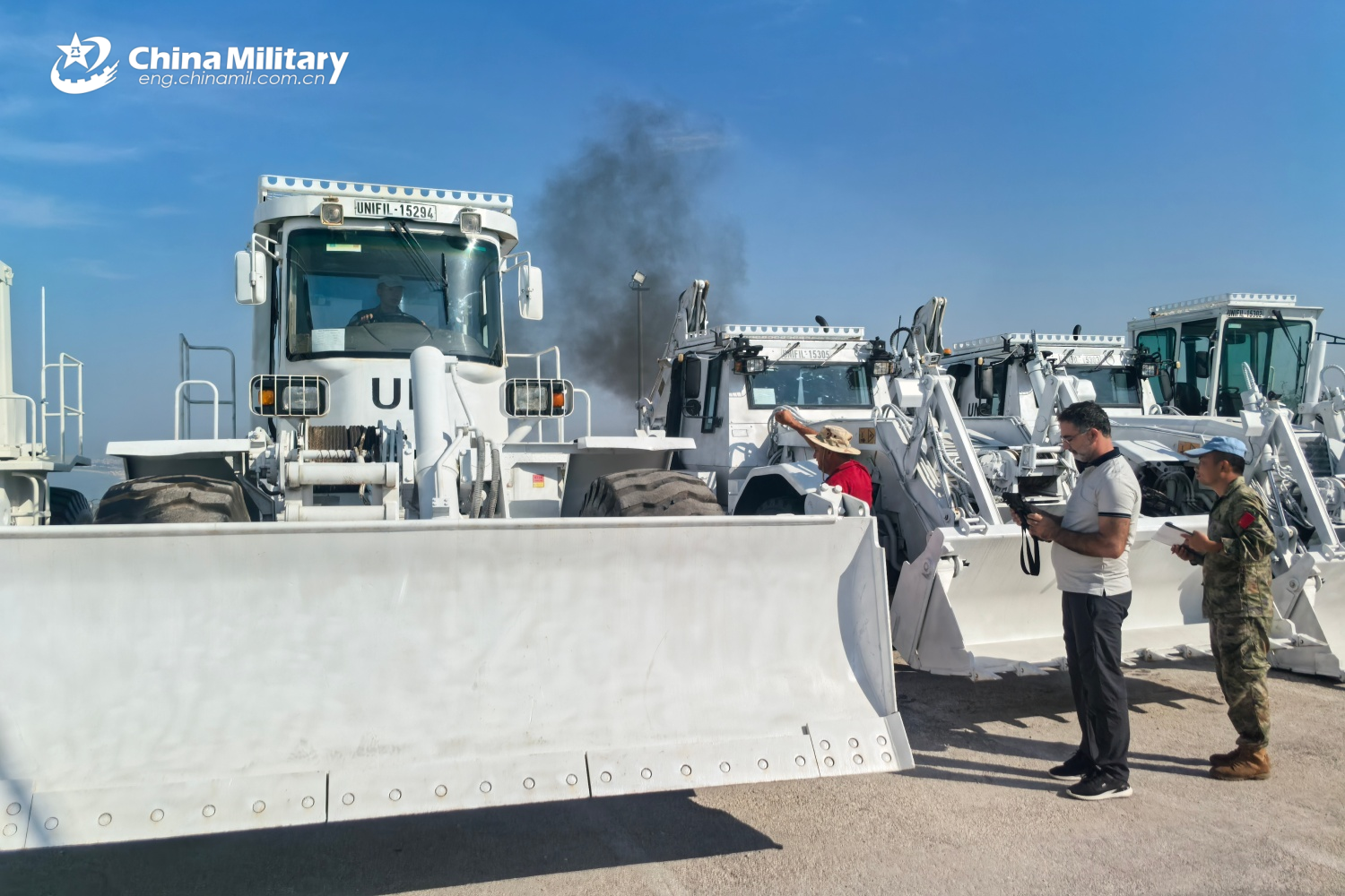 An inspector sent by the UNIFIL headquarters examines the engineering equipment at the camp of the 23rd Chinese peacekeeping force to Lebanon. (Photo by Liu Yapeng)