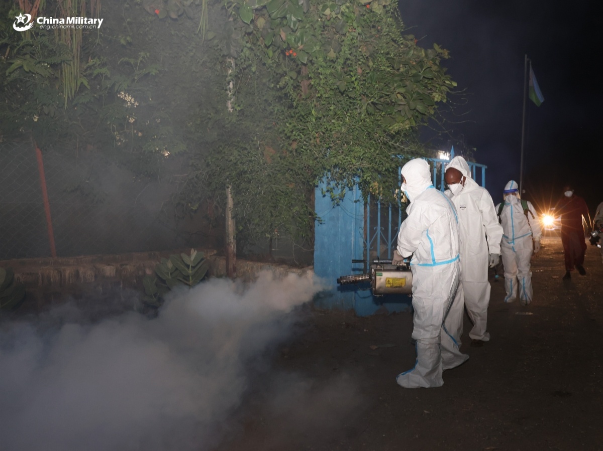 Soldiers assigned to the Chinese PLA Support Base in Djibouti conduct on-site disinfection.