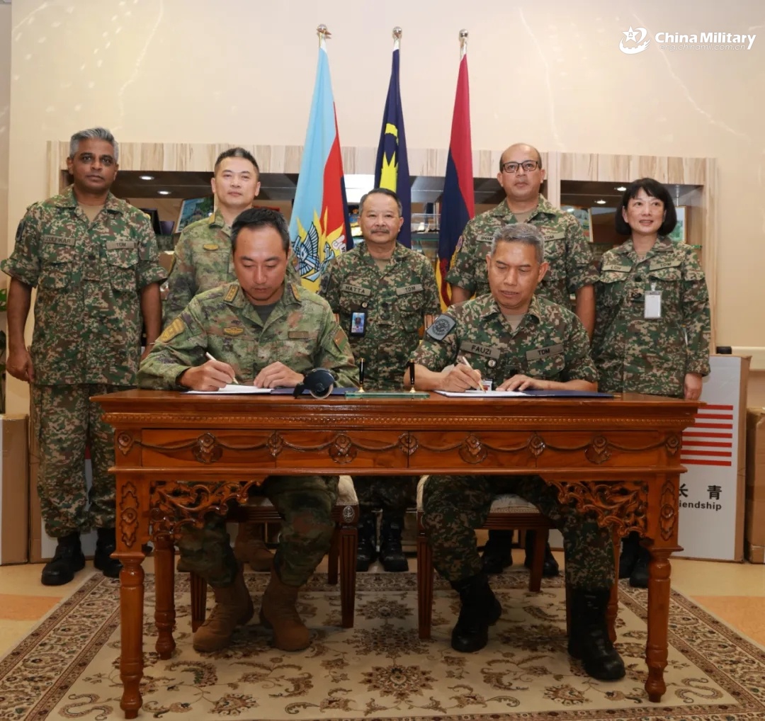 Chinese and Malaysian service members communicate with each other during the Chinese medical and epidemic prevention team's visit to Tuanku Mizan Military Hospital in Malaysia on October 16, 2025.