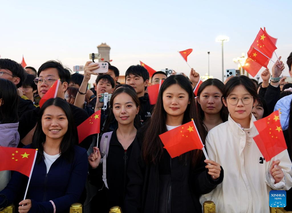 People pose for a photo after a flag-raising ceremony marking the 76th anniversary of the founding of the People's Republic of China at Tian'anmen Square in Beijing, capital of China, Oct. 1, 2025. (Xinhua/Ju Huanzong)
