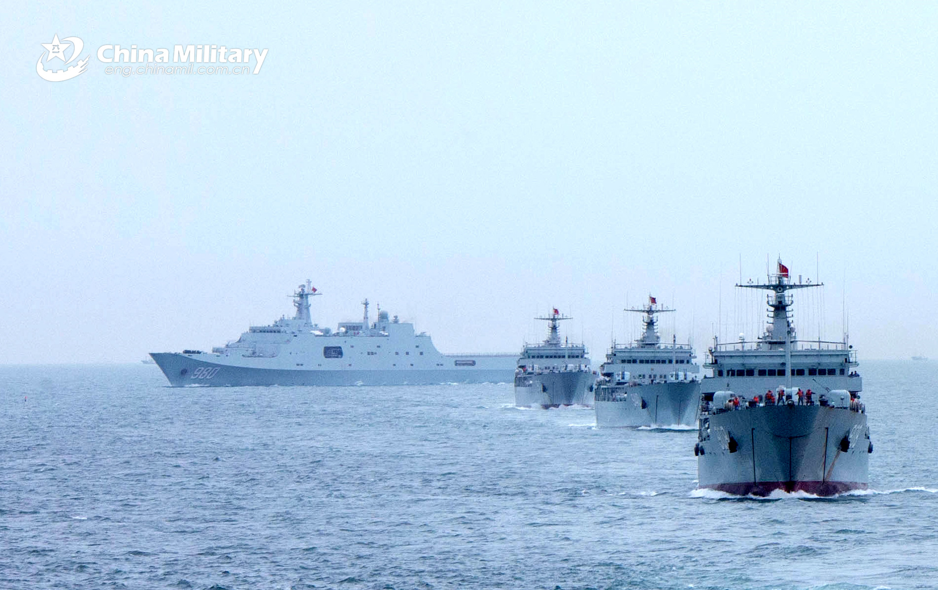 A naval formation led by the Type 071 amphibious transport dock Longhushan (Hull 980) attached to a unit of the navy under the Chinese PLA Eastern Theater Command sails to designated area during a multi-subject maritime training exercise in early October, 2025. (eng.chinamil.com.cn/Photo by Wang Chao)