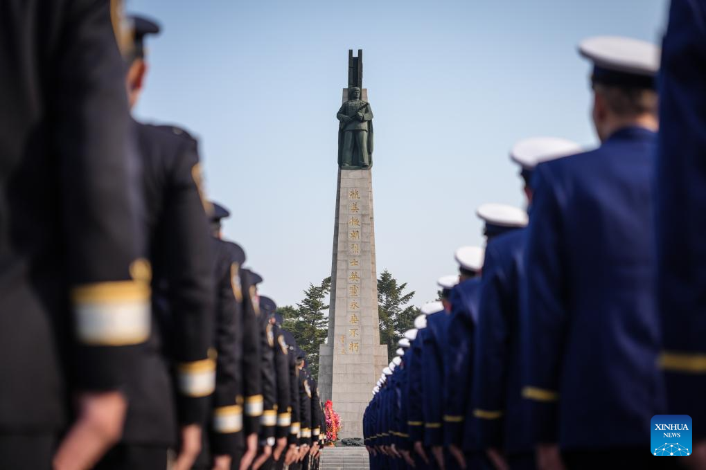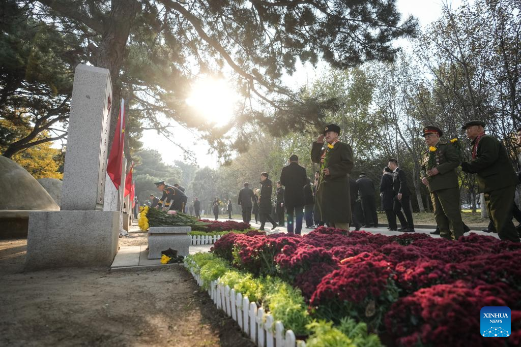 A flower baskets presenting ceremony is held at the Chinese People's Volunteers (CPV) martyrs' cemetery in Shenyang, northeast China's Liaoning Province, Oct. 25, 2025. Liaoning Province on Saturday held flower baskets presenting ceremonies in Shenyang and Dandong to commemorate the 75th anniversary of the CPV's entering the Democratic People's Republic of Korea to fight in the War to Resist U.S. Aggression and Aid Korea. (Xinhua/Pan Yulong)