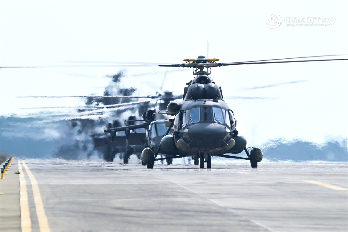 Multi-type helicopters attached to a brigade under the Chinese PLA Army lift off successively for a formation flight training exercise on October 16, 2025. (eng.chinamil.com.cn/Photo by Zhou Zelai)