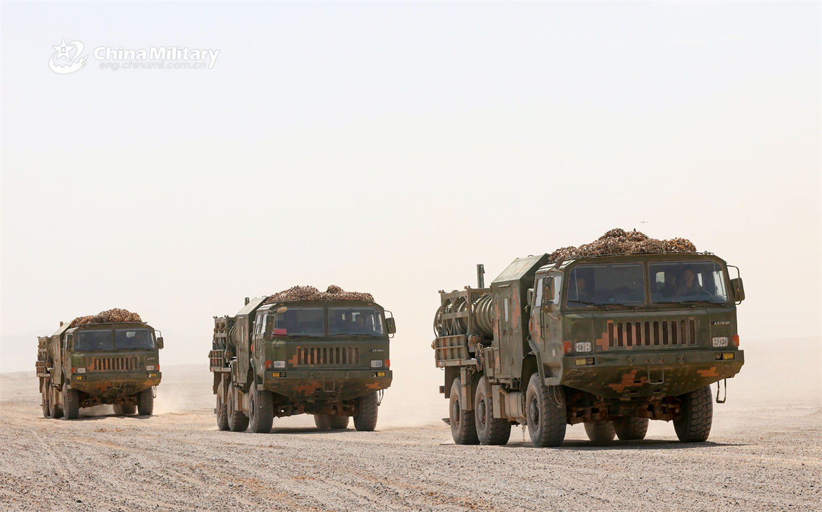 Vehicles attached to a brigade under the Chinese PLA 82nd Group Army maneuver to the designated area during a live-fire shooting training exercise in the Gobi Desert. (eng.chinamil.com.cn/Photo by Wang Haoming)