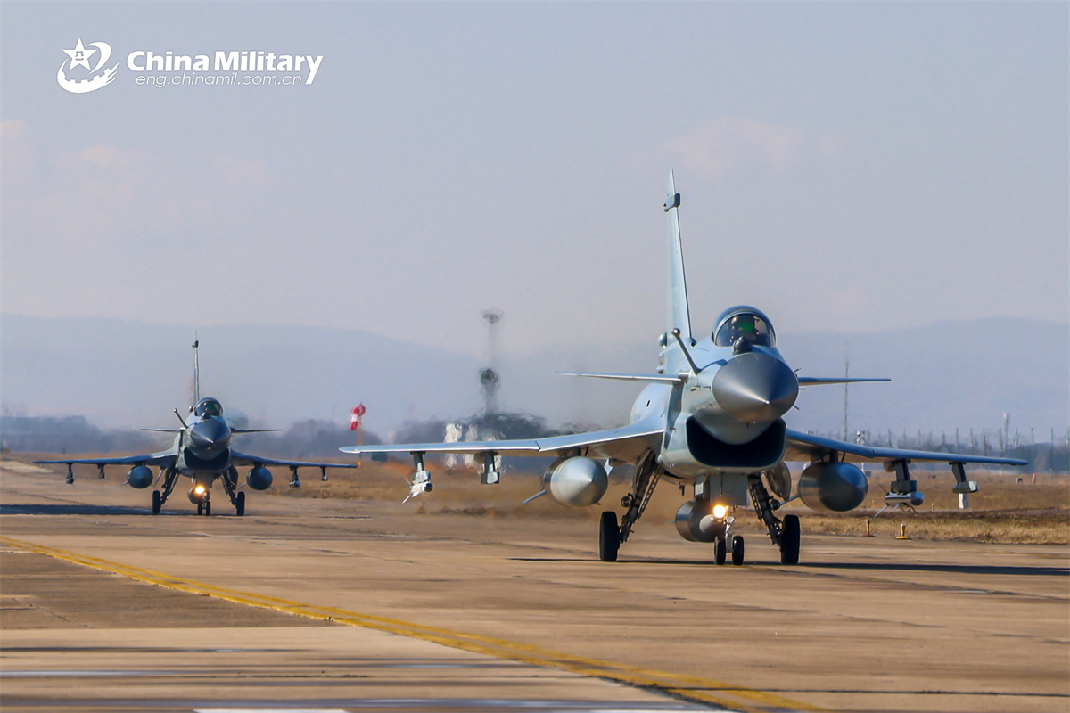 The picture shows a group of J-10 fighter jets taxing down the runway in formation after landing. In late October, 2025, a brigade assigned to the air force under the Chinese PLA Northern Theater Command organized its troops stationed and training outside to return. (eng.chinamil.com.cn/Photo by Xu Lin)