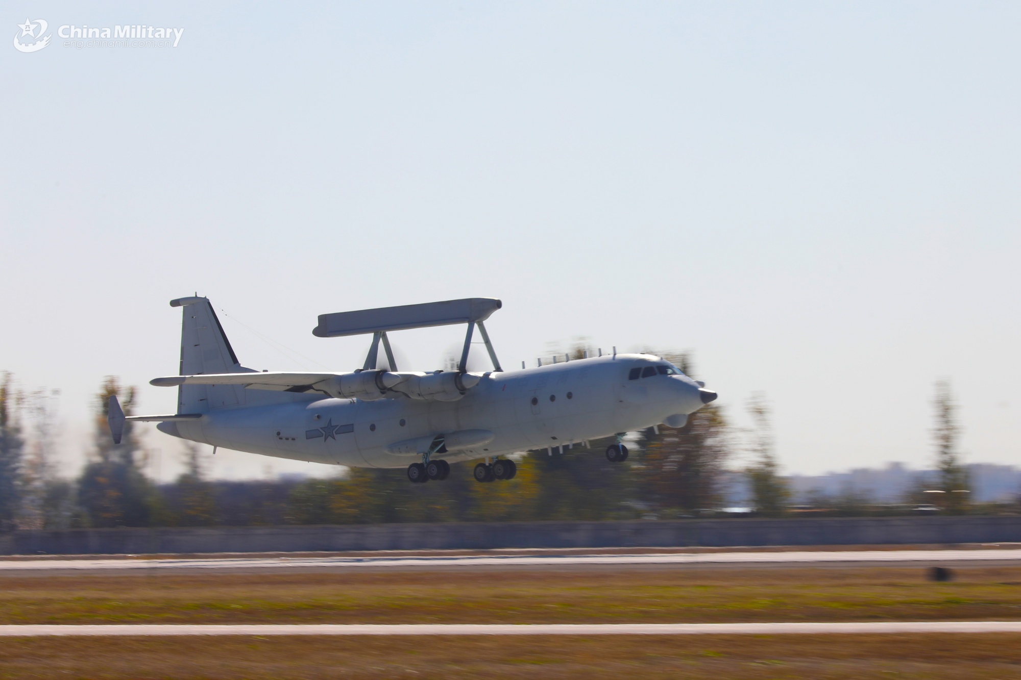 A KJ-200 airborne early warning (AEW) aircraft attached to an aviation unit under the Chinese PLA Navy takes off for a flight training exercise on November 10, 2025. (eng.chinamil.com.cn/Photo by Xing Yun)