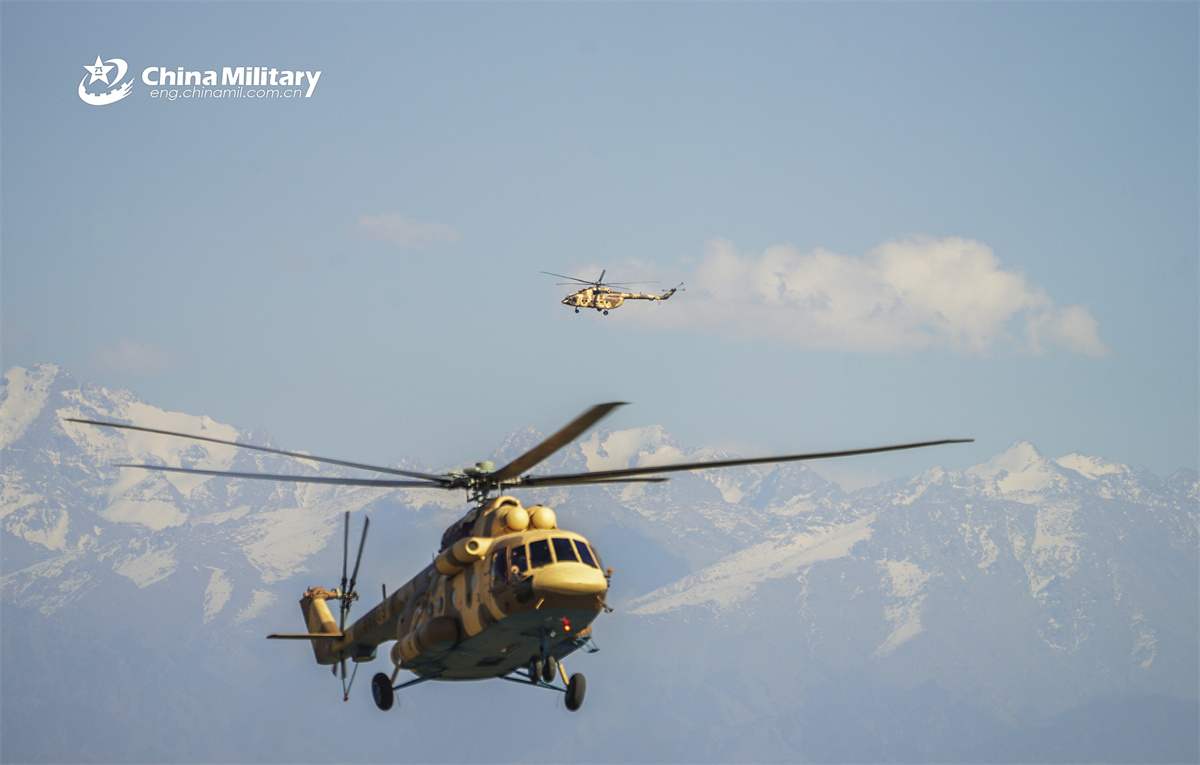 Two transport helicopters attached to a brigade under the Chinese PLA Xinjiang Military Command fly above the snow-capped mountains during a flight training exercise in late November, 2025. (eng.chinamil.com.cn/Photo by Wang Jianghao)