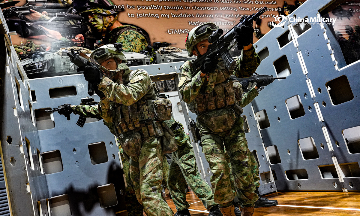 Mixed China-Singapore units conducted coordinated operations, where reconnaissance robots and drones were used to support simulated encirclement, sniper control, rapid entry, firepower strikes and hostage rescue.