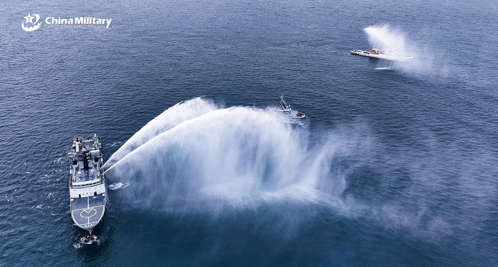 A rescue ship (L) attached to a logistic and rescue support flotilla under the Chinese PLA Navy sprays water to assist in the damage control operations of a tugboat (M) "caught on fire" during a multi-subject training exercise in early December, 2025. (eng.chinamil.com.cn/Photo by Dai Siyuan)