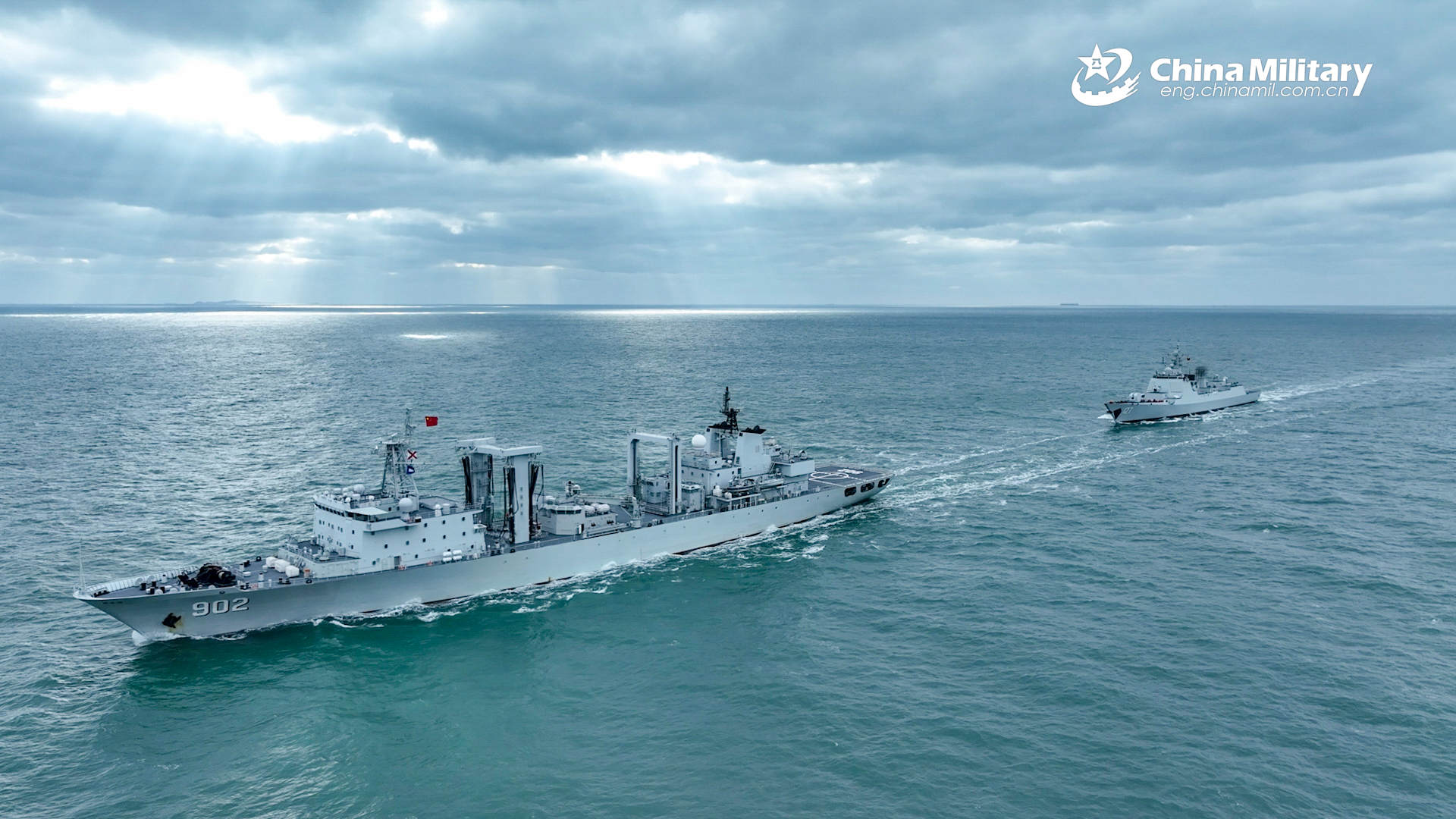 The comprehensive supply ship DongPinghu (Hull 902) and Type 052D guided-missile destroyer Zhumadian (Hull 127) attached to a naval flotilla under the Chinese PLA Navy sail in formation during a replenishment-at-sea training exercise in mid-December, 2025. (eng.chinamil.com.cn/Photo by Zhou Yuanzhi)