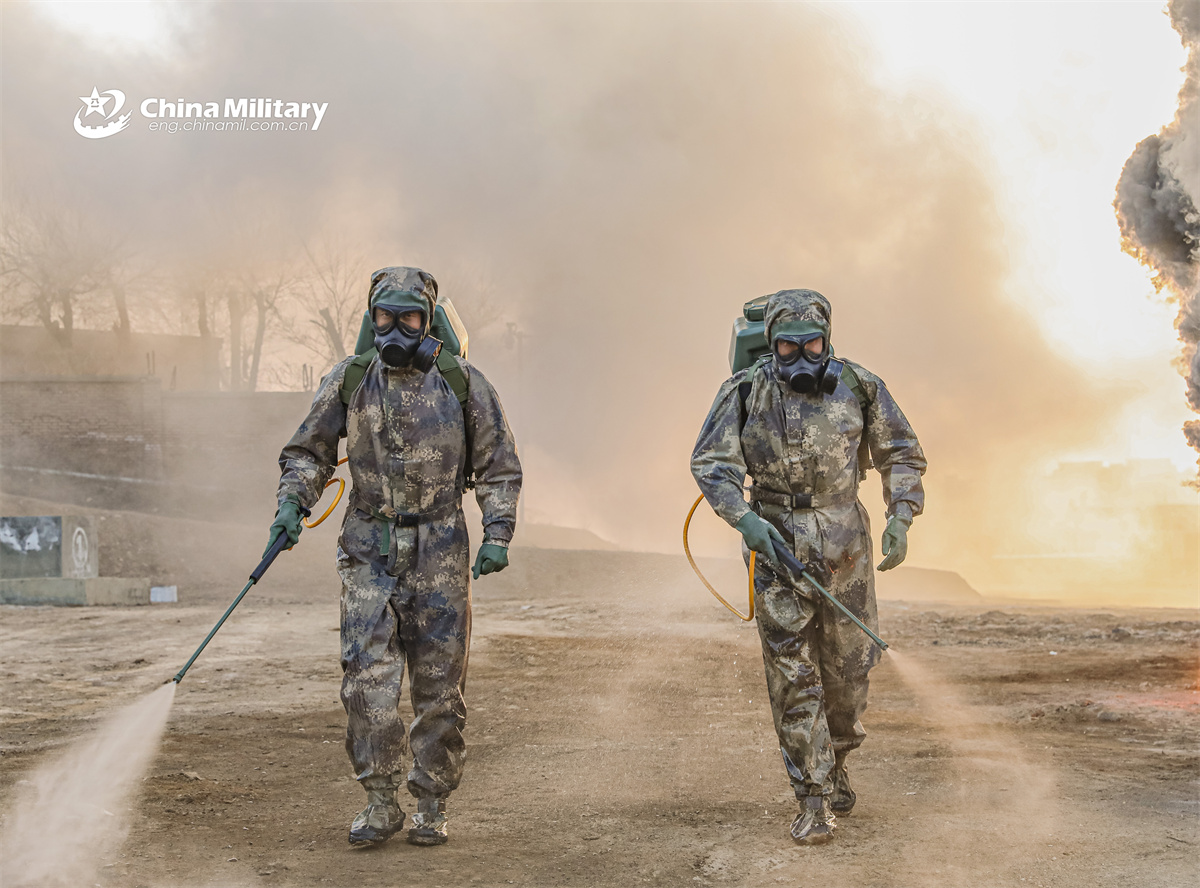 Soldiers assigned to a regiment under the Chinese PLA Army decontaminate the contaminated zoneduring a Chemical, Biological, Radioactive and Nuclear (CBRN) decontamination drill in late December, 2025. (eng.chinamil.com.cn/Photo by Zeng Cunjun)