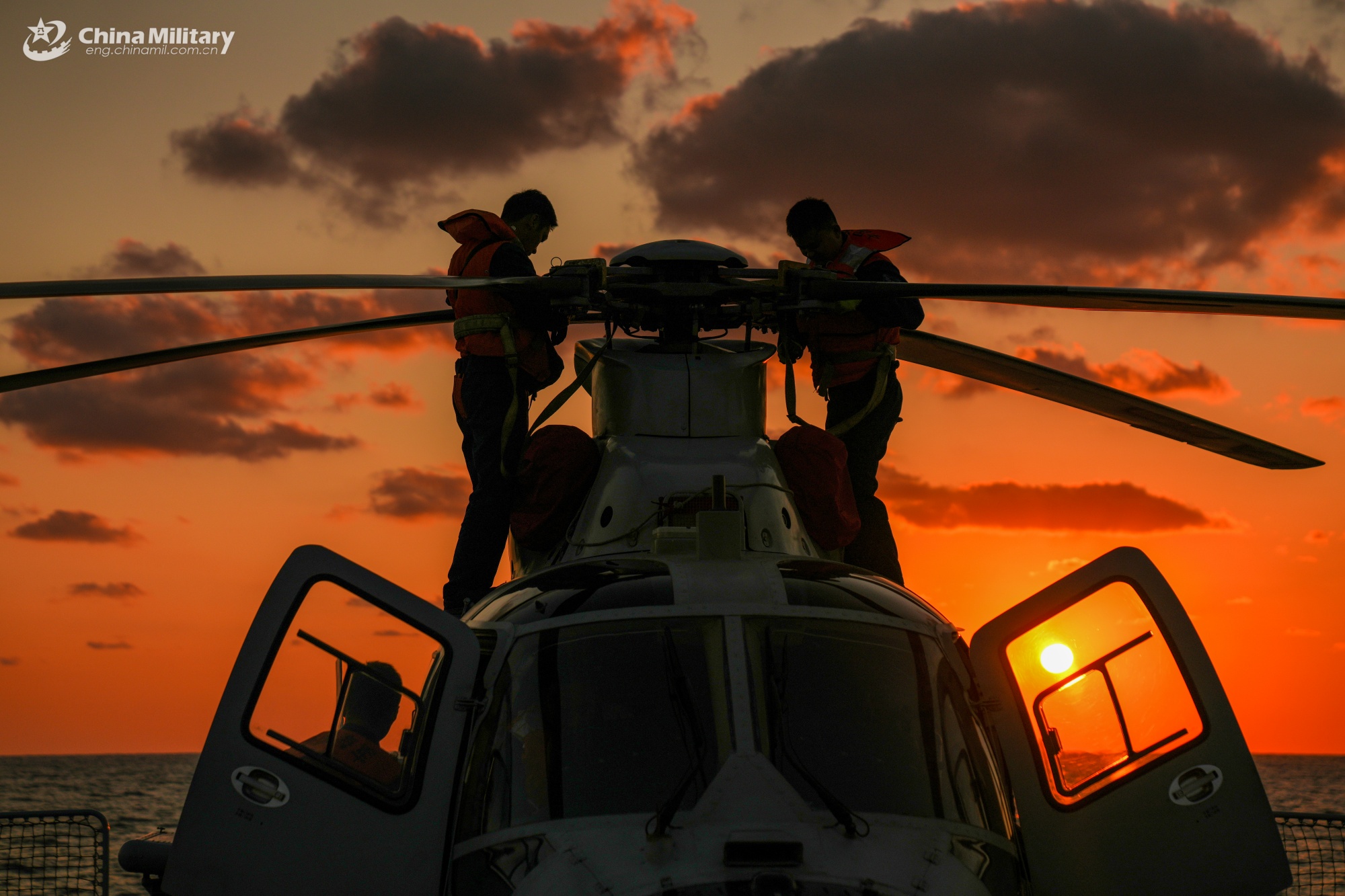 Sailors assigned to a unit with the navy under the Chinese PLA Eastern Theater Command conduct pre-flight check on a ship-borne helicopter during a multi-subject flight training exercise on January 7, 2026. (eng.chinamil.com.cn/Photo by Yu Mingzhe)