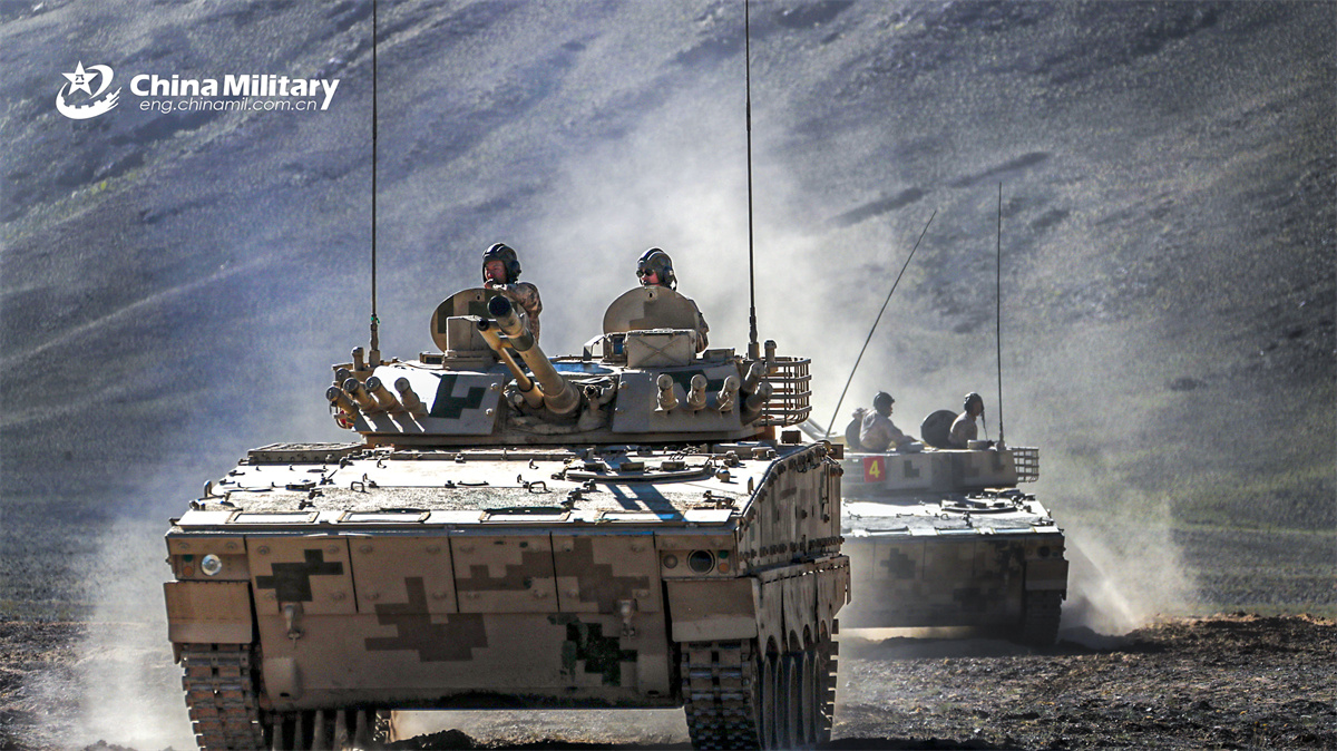 ZBD-04A tracked infantry fighting vehicles (IFVs) attached to a brigade under the Chinese PLA 77th Group Army maneuver to the designated area during a full-element combat training exercise in mid-January, 2026. (eng.chinamil.com.cn/Photo by Huang Wei, Jing Fulin and Liu Haorui)
