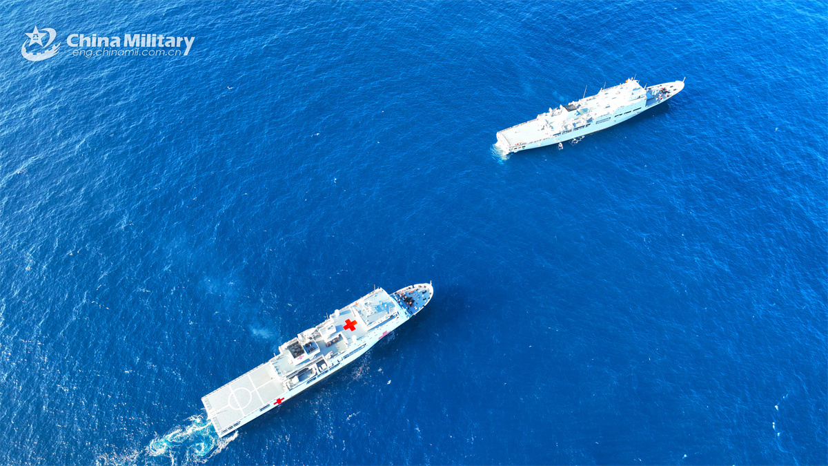 Hospital ship Youai (Hull 861) attached to a flotilla with the navy under the Chinese PLA Southern Theater Command comes alongside the transport ship Nanyun 831 during a multi-subject training exercise in waters of the South China Sea. (eng.chinamil.com.cn/Photo by Wu Huangqing)