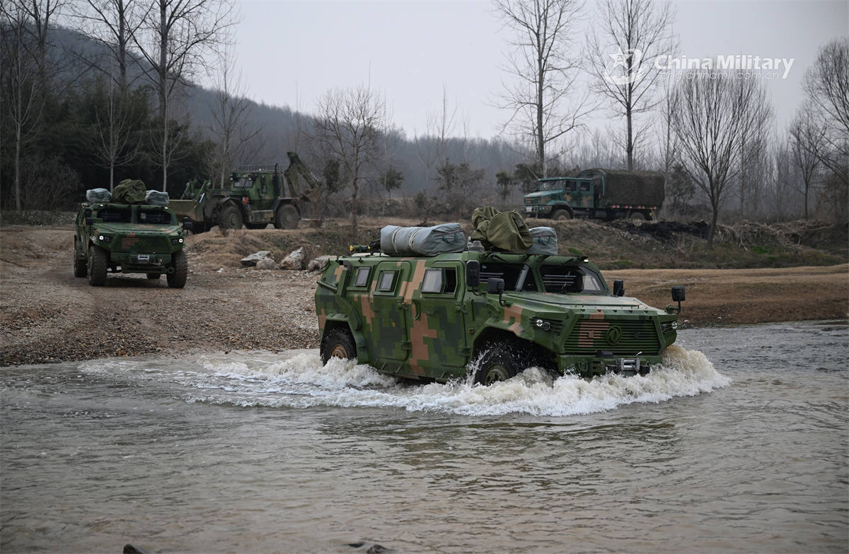 Multiple armored vehicles attached to a brigade under the Chinese PLA 82nd Group Army wade through the shallow water during a training exercise on January 28, 2026. (eng.chinamil.com.cn/Photo by Mu Ruilin)
