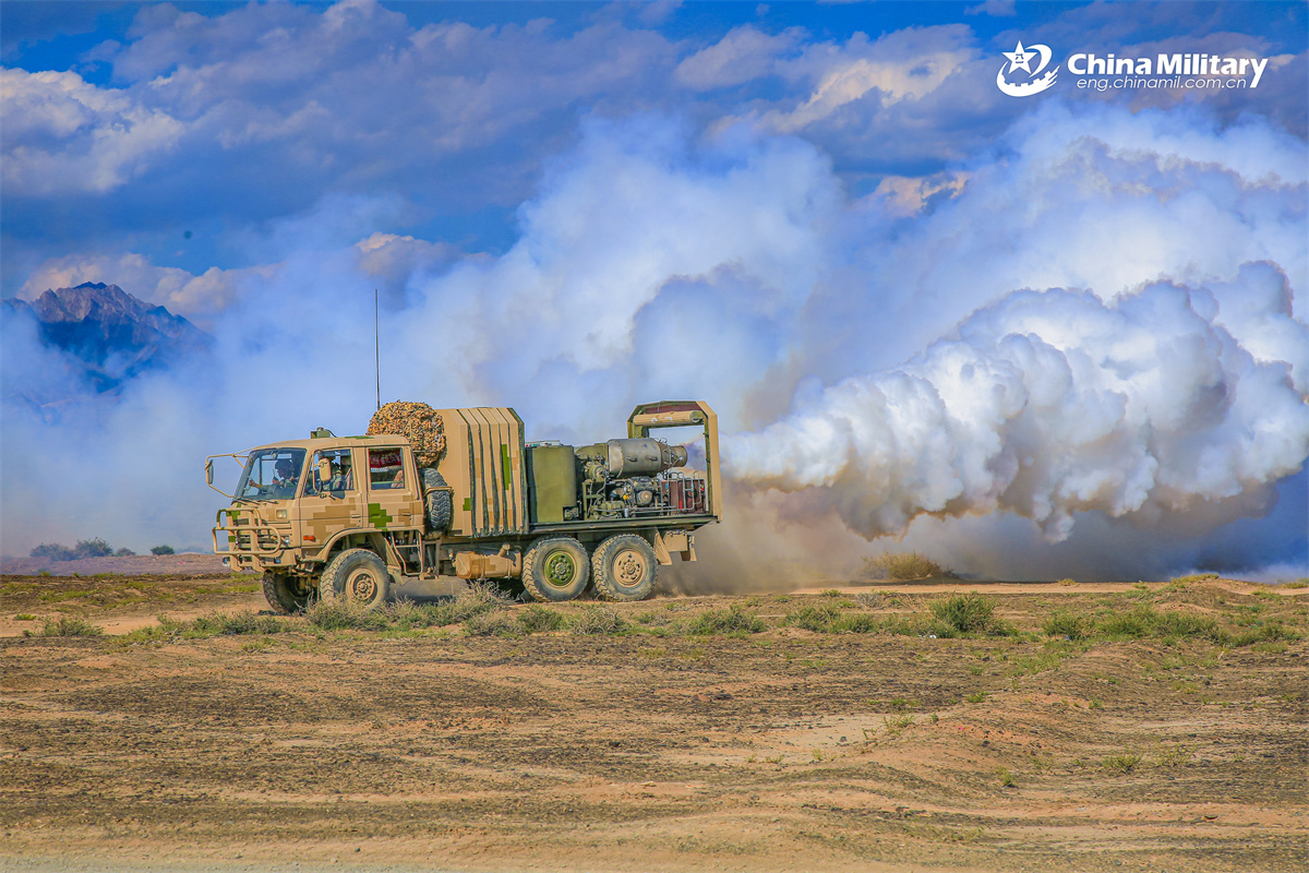 A military vehicle attached to the Chinese PLA Army releases smoke during a Chemical, Biological, Radioactive and Nuclear (CBRN) decontamination drill. (eng.chinamil.com.cn/Photo by Zeng Cunjun)