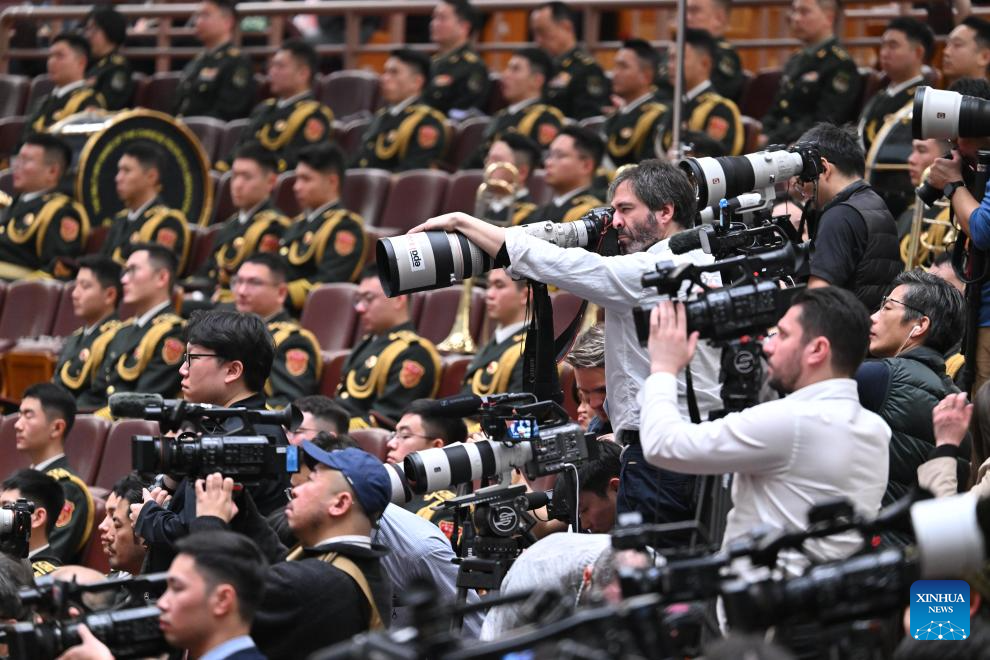 Journalists work at the opening meeting of the fourth session of the 14th National People's Congress (NPC) at the Great Hall of the People in Beijing, capital of China, March 5, 2026. (Xinhua/Li Xin)