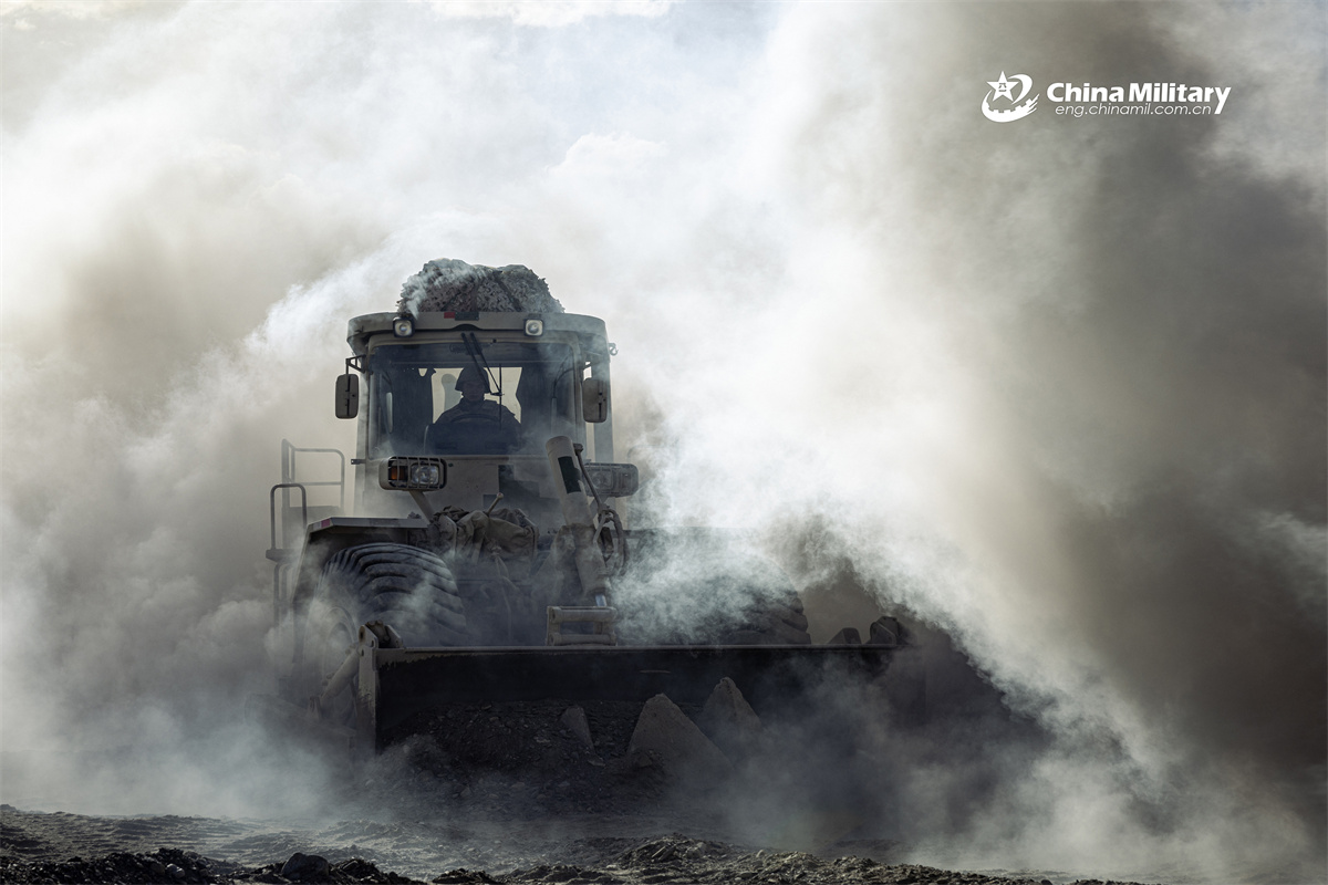 A soldier assigned to a regiment under the Chinese PLA Army operates a bulldozer to repair the road during a comprehensive support training exercise in late February, 2026. (eng.chinamil.com.cn/Photo by Li Longfei)