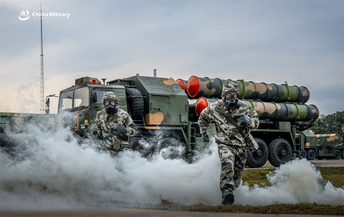 Soldiers assigned to an air-defense unit under the Chinese PLA Air Force conduct Chemical, Biological, Radioactive and Nuclear (CBRN) decontamination operations during a multi-subject training exercise on February 27, 2026. (eng.chinamil.com.cn/Photo by Chen Yi)