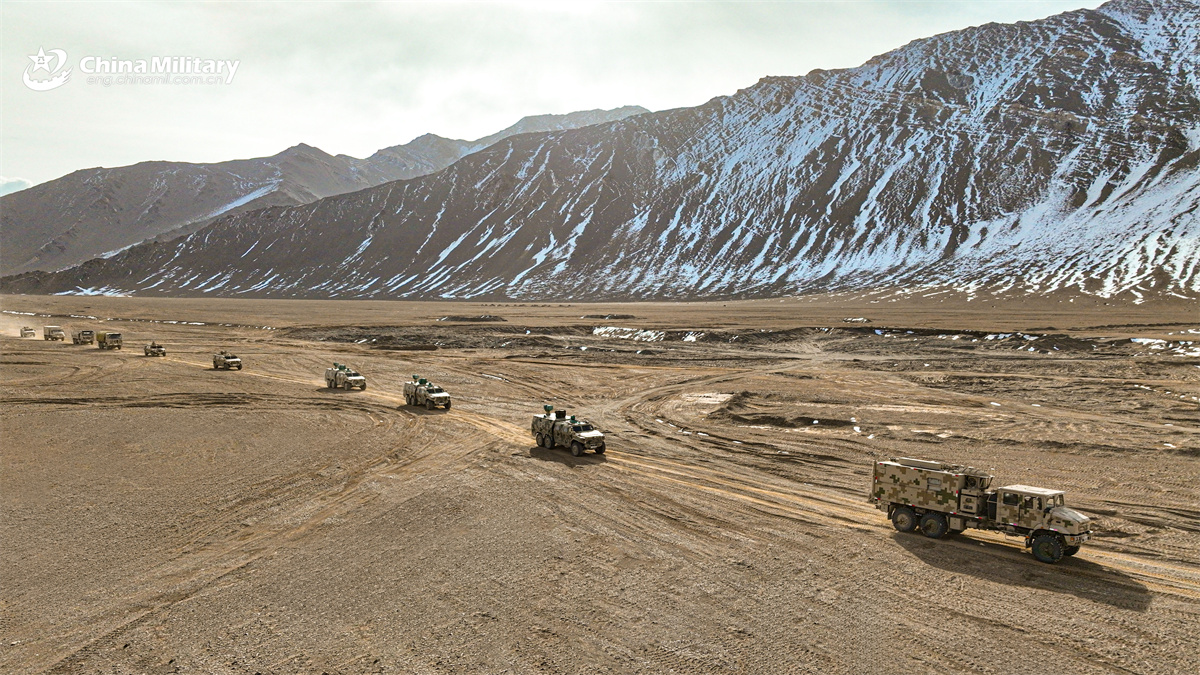 Military vehicles attached to a regiment under the Chinese PLA Xinjiang Military Command are en route to the designated area during a plateau driving training exercise at an altitude of more than 4,000 meters.(eng.chinamil.com.cn/Photo by Ma Tailang)