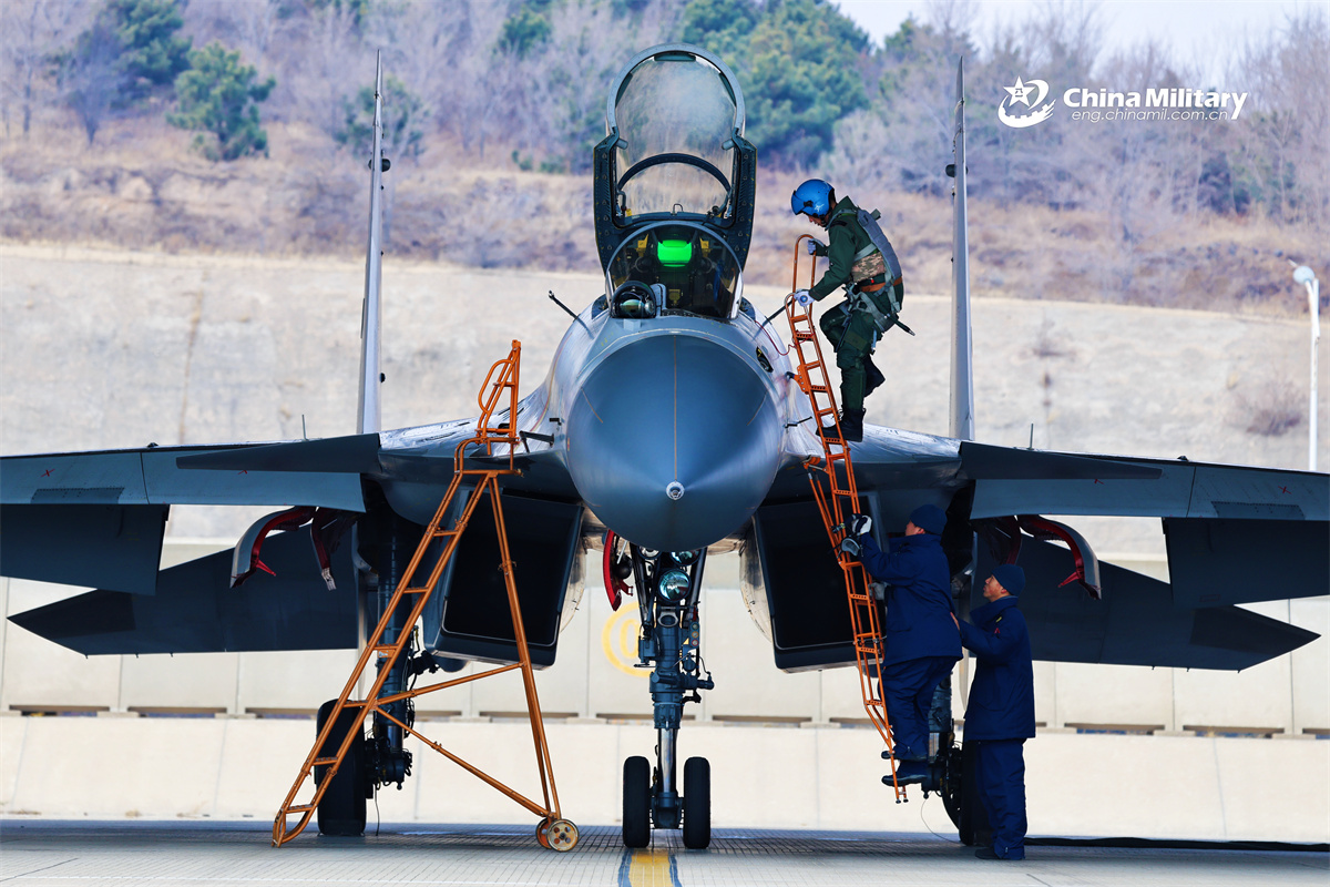 A pilot assigned to a base of the Chinese PLA Naval Aviation University climbs into the cockpit of a J-15 carrier-based fighter jet during a flight training exercise in mid-March, 2026. (eng.chinamil.com.cn/Photo by Jiang Tao)
