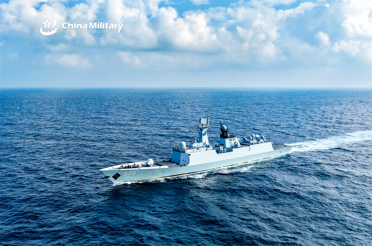 The guided-missile frigate Daqing (Hull 576) attached to the 48th Chinese naval escort taskforce maneuvers at sea during a surface gunnery exercise. (eng.chinamil.com.cn/Photo by Ma Yubin)