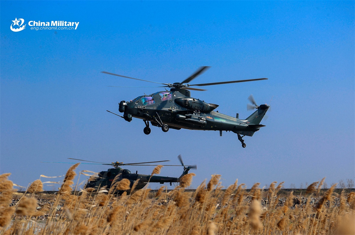 A Z-10 attack helicopter and a Mi-171 transport helicopterattached to a brigade under the Chinese PLA Army fliesat ultra-low altitude during a training exercise on March 12, 2026. (eng.chinamil.com.cn/Photo by Chen Yu)