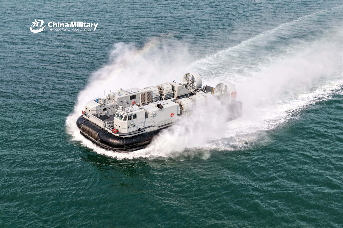 A Landing Craft Air Cushion (LCAC) attached to a landing ship group with the navy under the Chinese PLA Southern Theater Command kicks up spray during a maritime training exercise on March 27, 2026. (eng.chinamil.com.cn/Photo by Mi Xuechao)