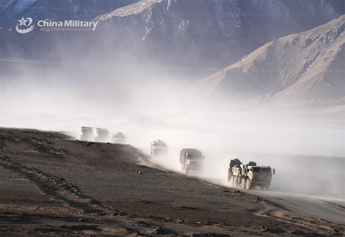 Military vehicles attached to an army regiment under the Chinese PLA Xinjiang Military Command march forward during a long-distance maneuver training exercise on April 17, 2026. (eng.chinamil.com.cn/Photo by Chen Jiliang)