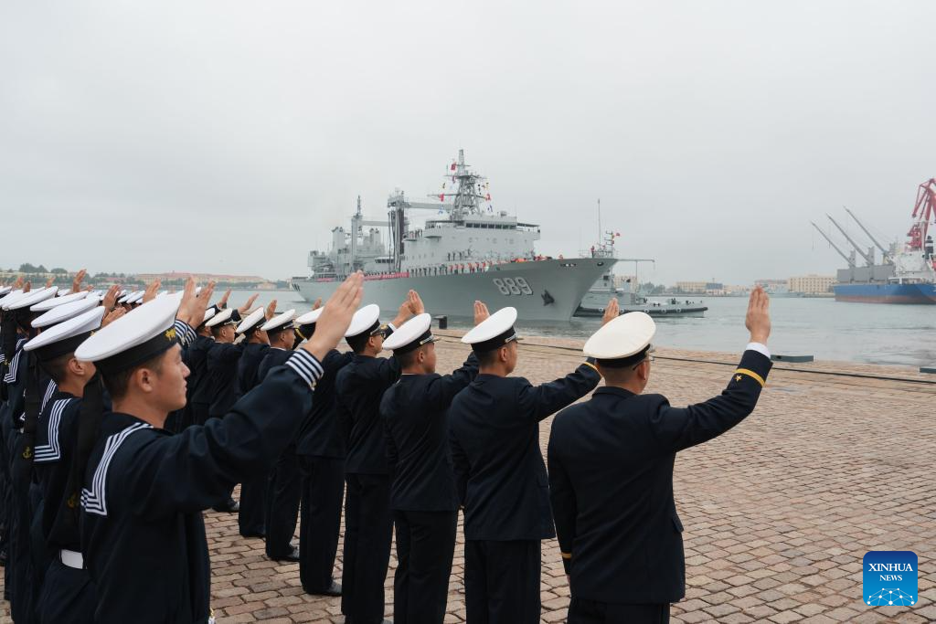 Officers and soldiers wave goodbye to comprehensive supply ship Taihu at a port in Qingdao, east China's Shandong Province, Oct. 11, 2025. A new fleet of the Chinese People's Liberation Army Navy set sail from a military port in Qingdao, east China's Shandong Province, on Saturday to take over an escort mission from the previous fleet in the Gulf of Aden and waters off Somalia.