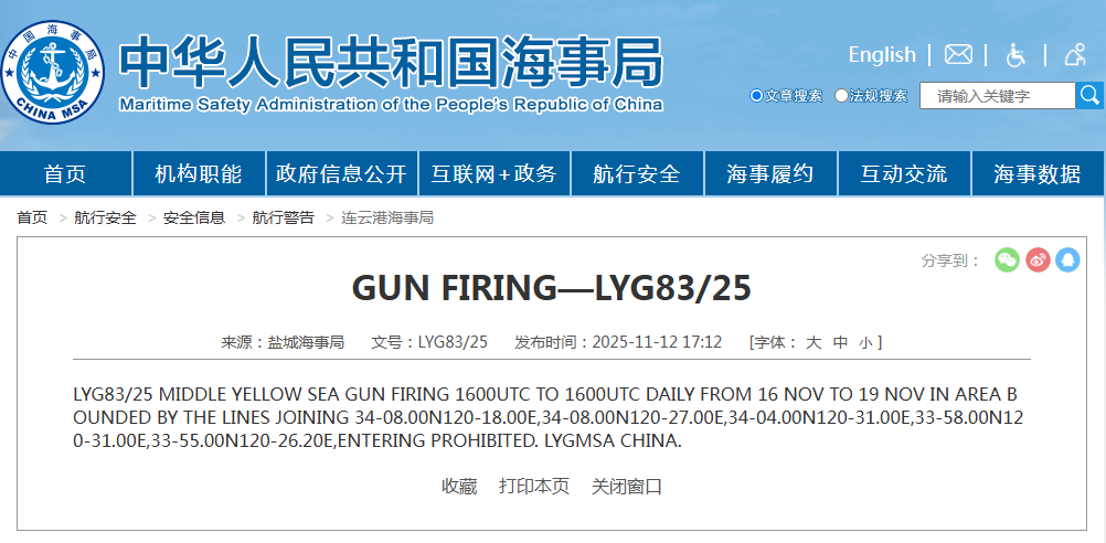 BEIJING, Nov. 17 -- According to a navigation warning notice released by China's Lianyungang Maritime Safety Administration, gun firing activities are being conducted from November 16 to 19, 2025, daily 00:00-24:00, in the middle waters of China's Yellow Sea. During this period, relevant waters are off-limits.